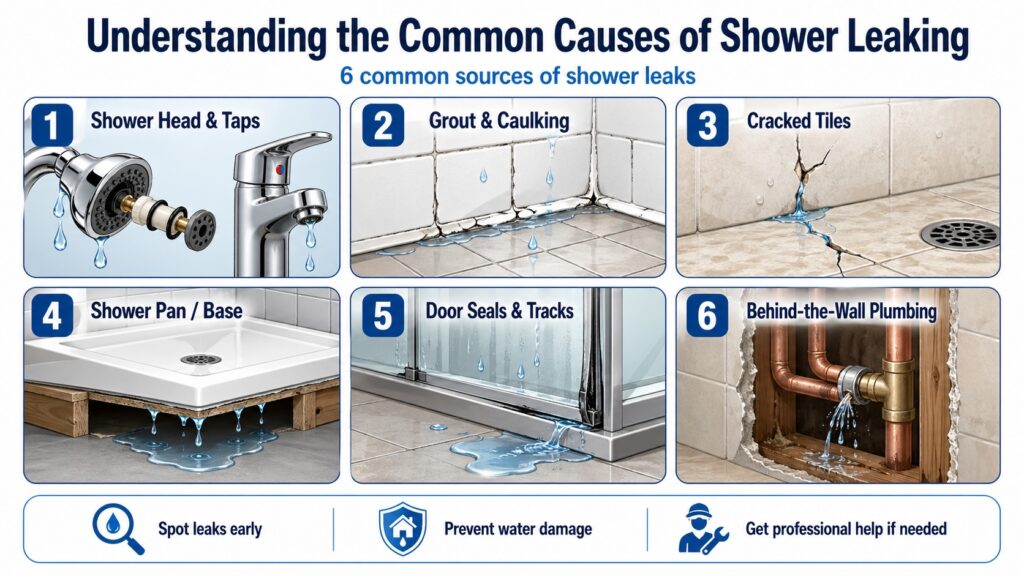 - Common causes include worn seals, damaged grout, cracked tiles, and faulty shower heads.